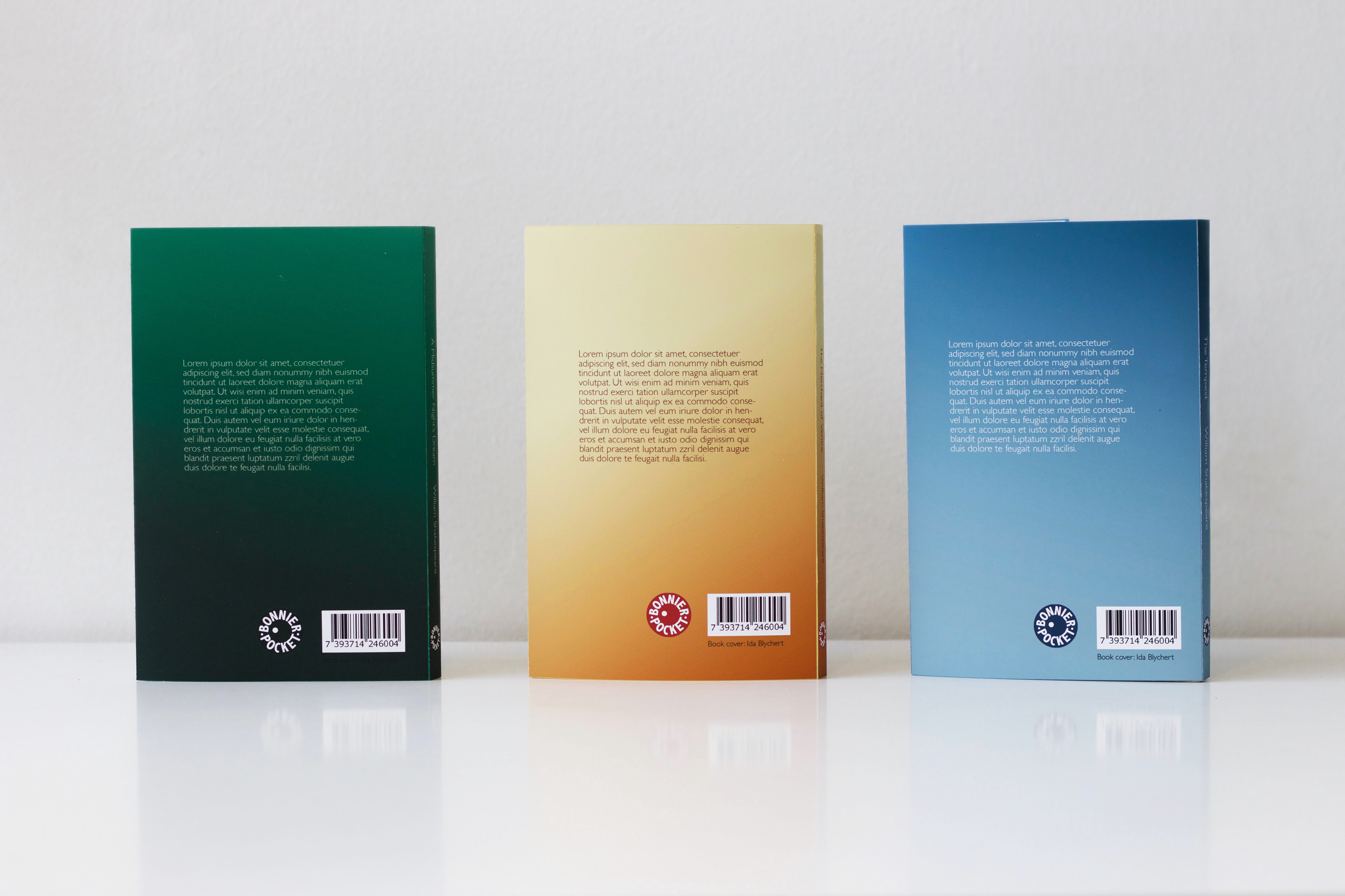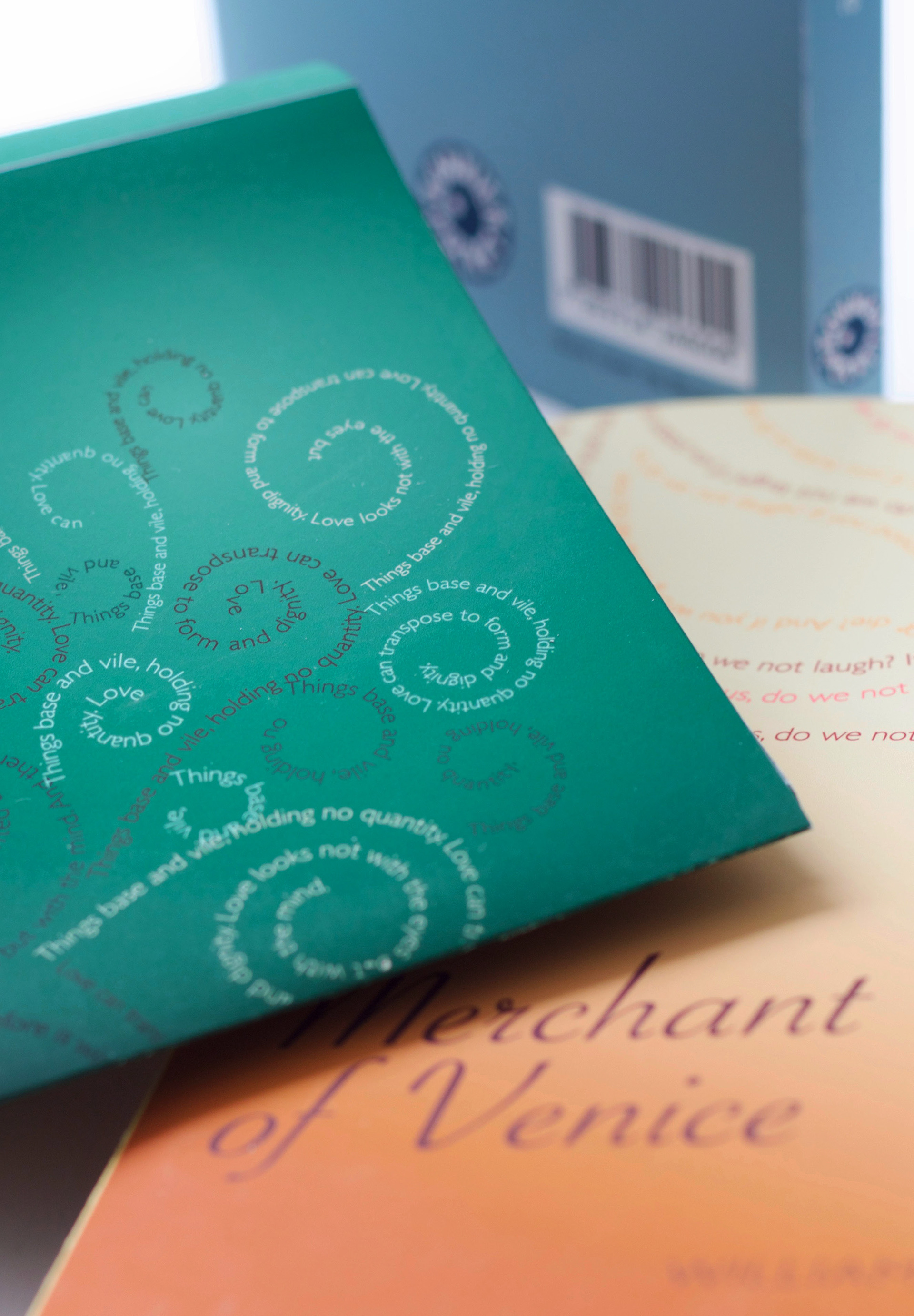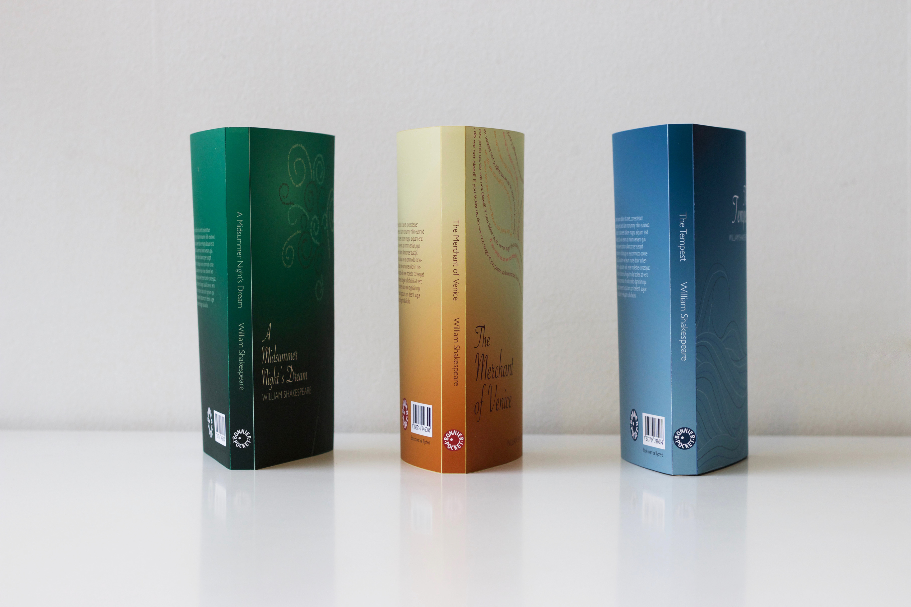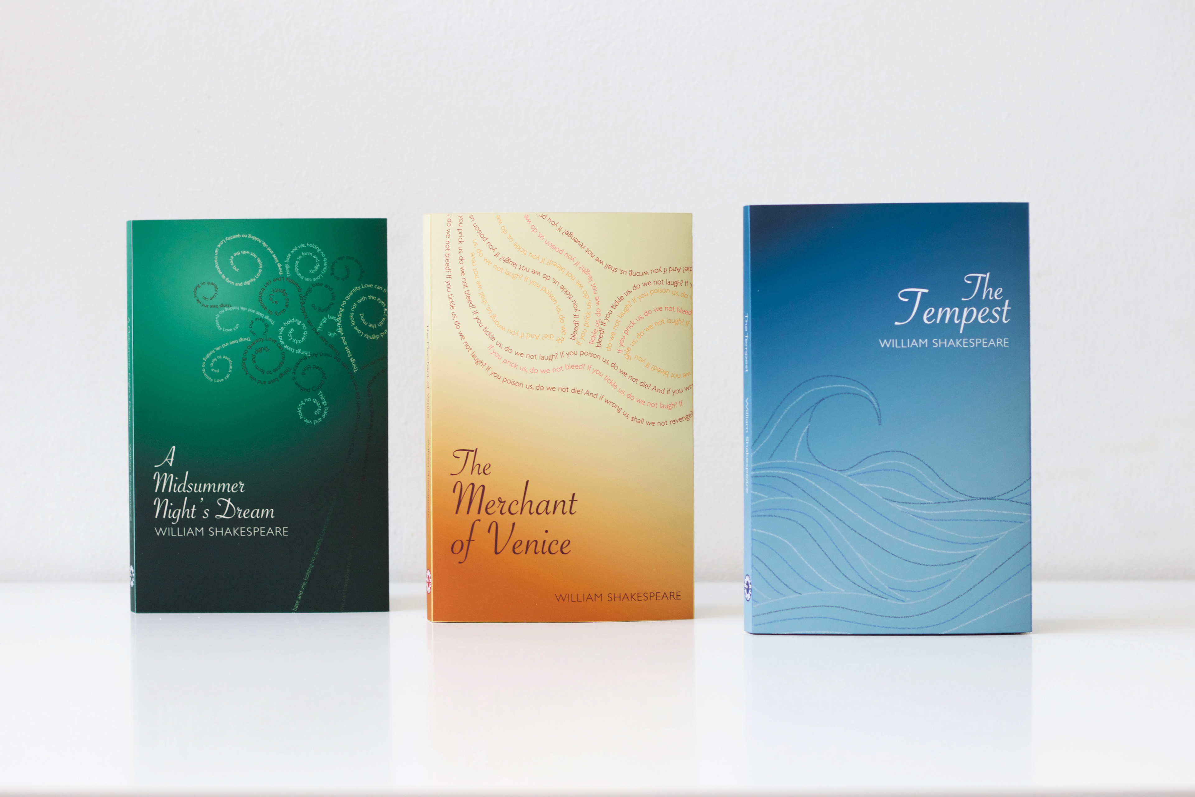 A series of book covers for the Shakespeare plays A Midsummer Night's Dream, The Merchant of Venice and The Tempest.